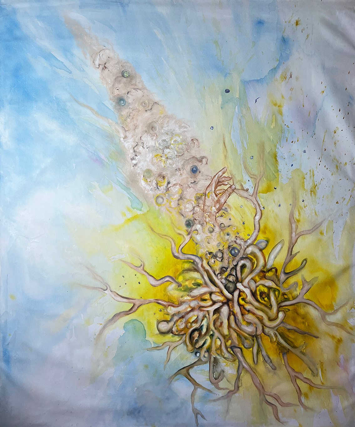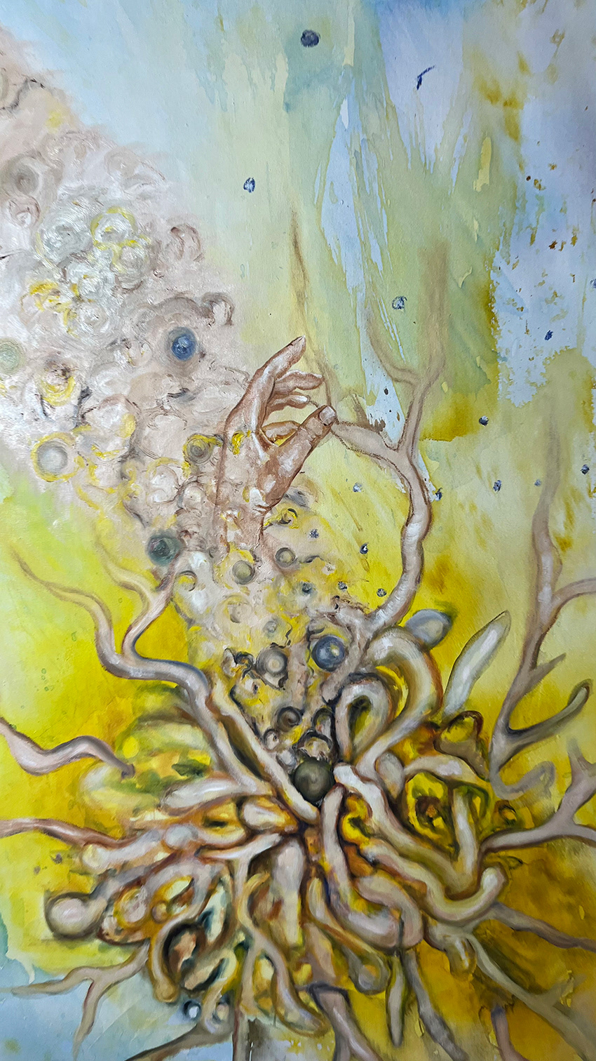 Ein Gewirr aus gedärmähnlichen Formen windet sich chaotisch, lebendig und roh. Aus diesem Knäuel bricht eine Hand hervor, ihre Finger strecken sich zögernd nach oben. Die Form erinnert an Michelangelos „Erschaffung Adams“, an die ikonische Berührung, die Leben gibt. Doch es ist nicht Adams Hand, es ist meine, die Hand der Künstlerin. Sie kommt aus dem Chaos, aus der Masse des Ungeschaffenen.